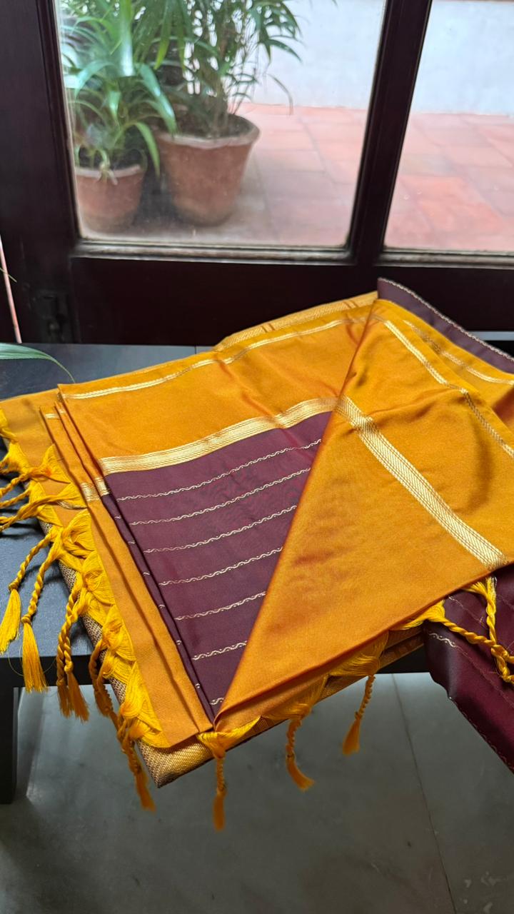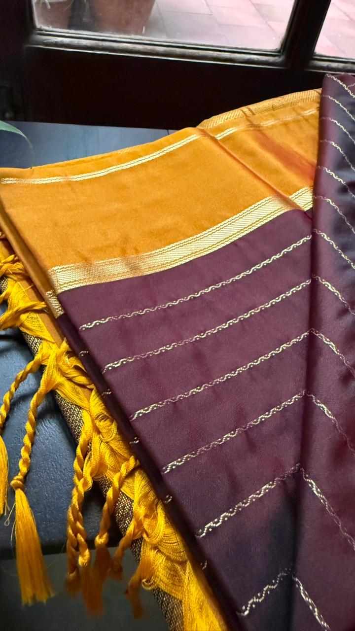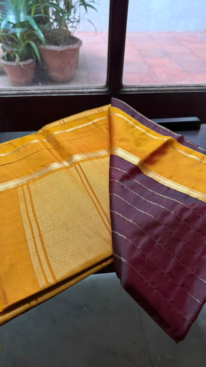 Coffee bean brown body with mustard yellow pallu and blouse, finished with a rettai pettu border. Crafted in soft silks for an elegant drape.