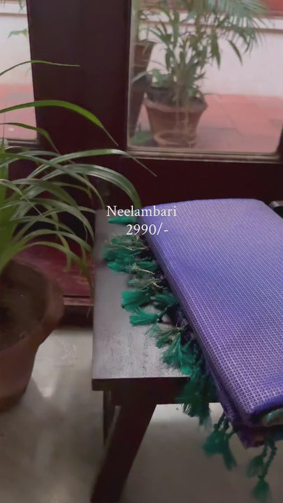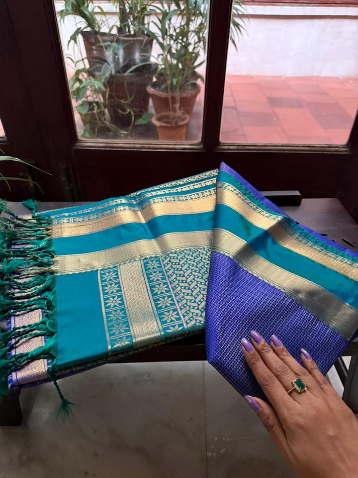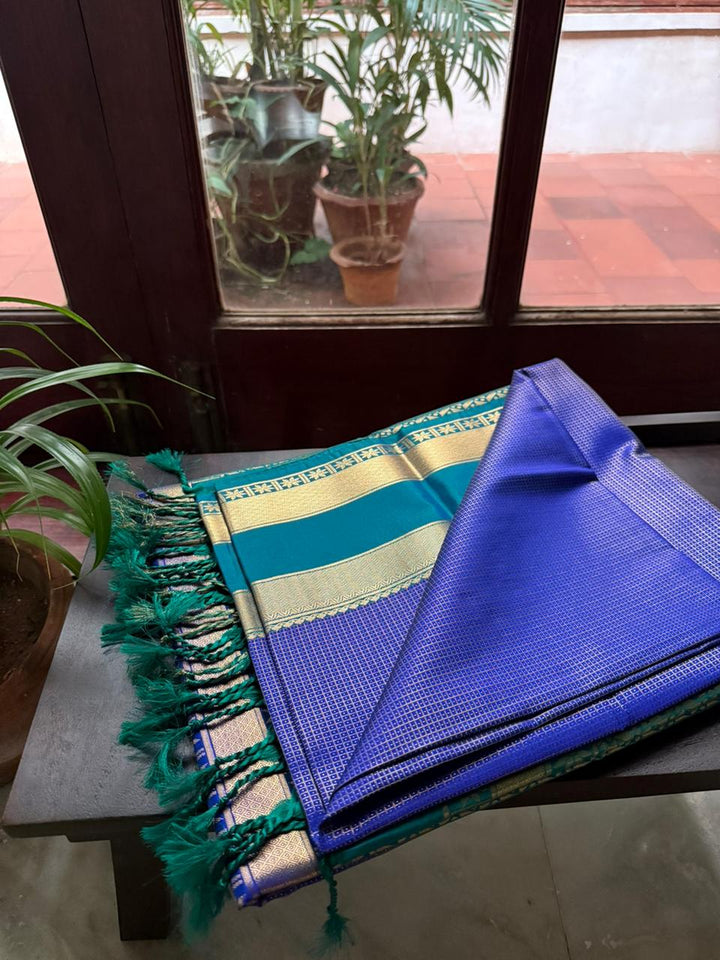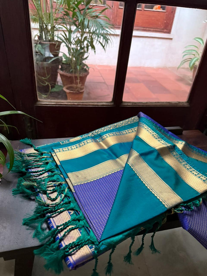 MS Blue Soft Silk Saree with Sea Green Pallu & Blouse, highlighted with a traditional Rettai Pettu Border. A perfect blend of elegance and heritage.