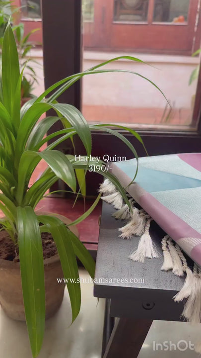 Soft silk Harley Quinn saree in multicolour shades of lilac and ice blue, featuring a lilac pallu and blouse. Borderless design with pastel tones, perfect for elegant occasions.