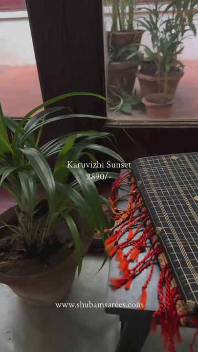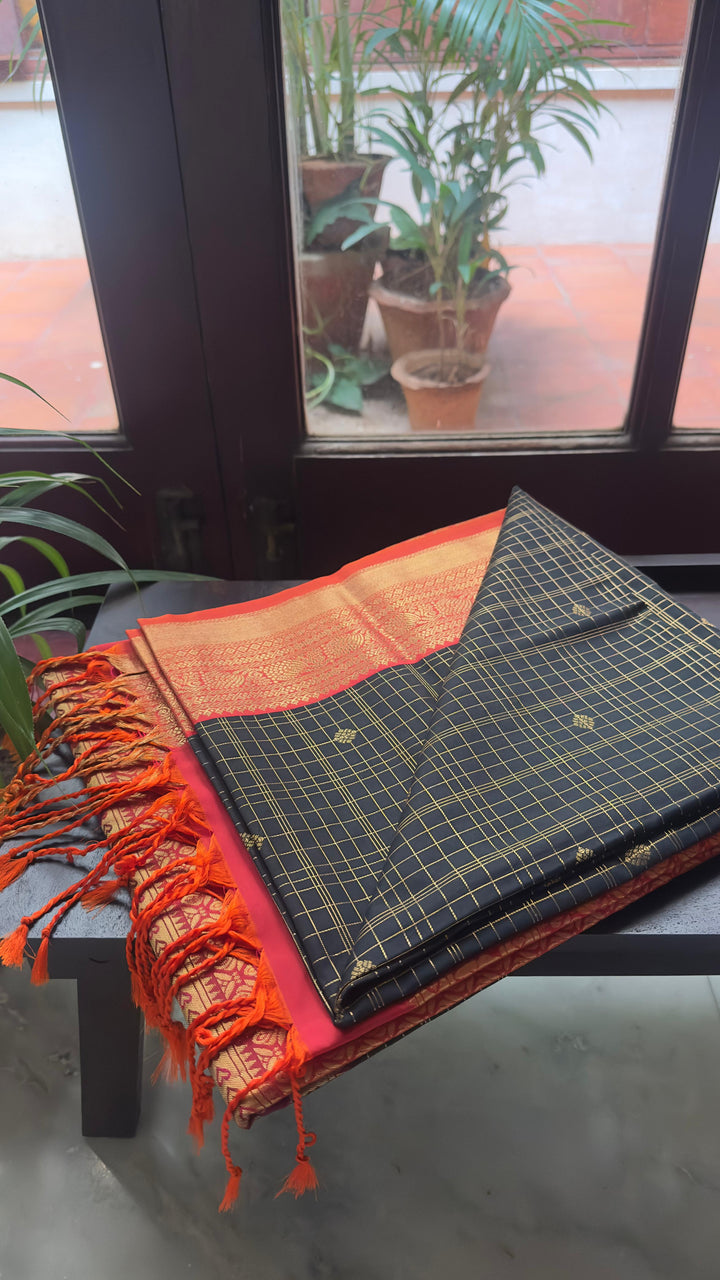 Karuvizhi Sunset Soft Silk – Black checked body, sunset orange pallu & blouse, finished with a vintage orange border. A timeless Parambriya classic.