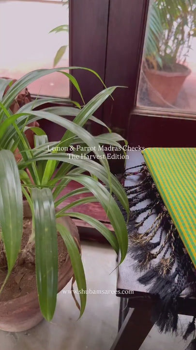 Soft silk saree with a lemon yellow and parrot green body, paired with a jamun fruit purple pallu and blouse. Finished with a traditional Rettai Pettu border, blending vibrant colors with elegant craftsmanship.