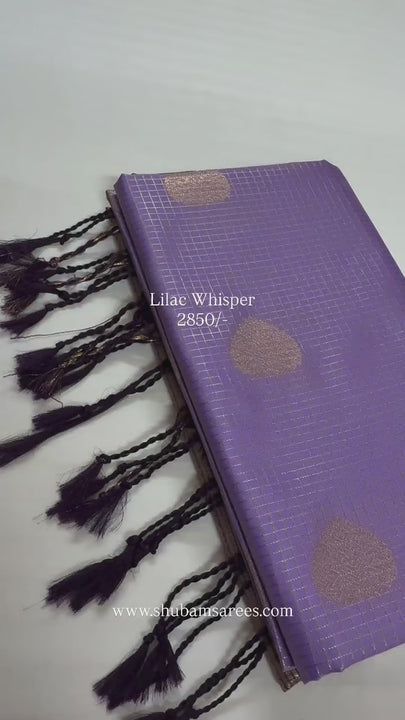 A charming pastel lilac body paired with a rich deep blackcurrant pallu and blouse, finished with a classic rettaipettu border. This pastel soft silk beautifully blends subtle elegance with traditional Parambriya craftsmanship.