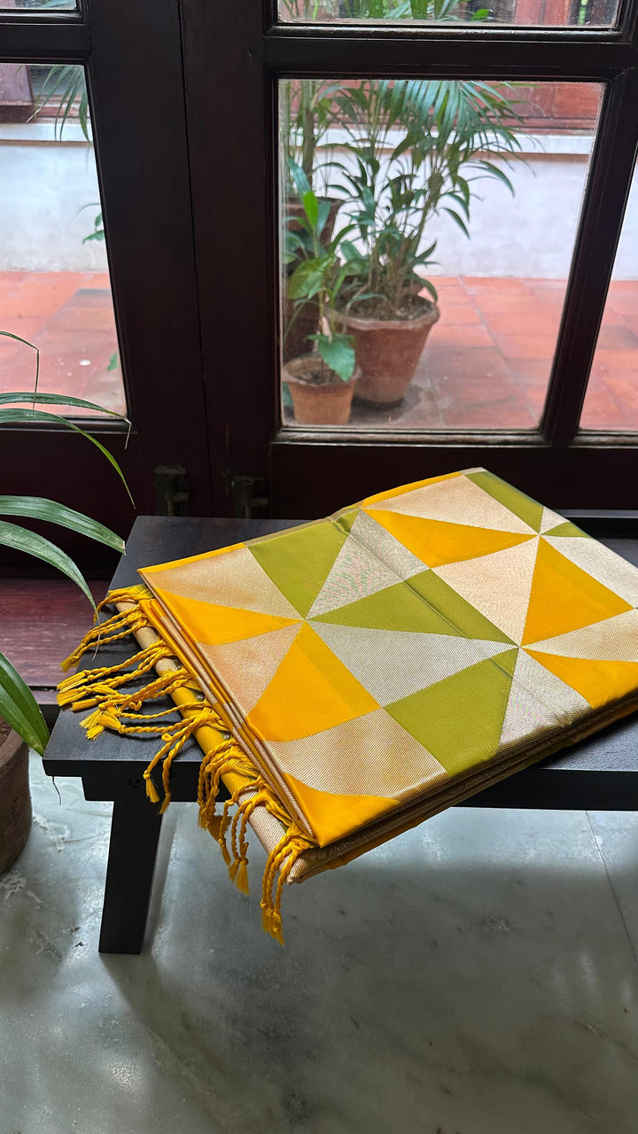 Mango Meadows Harley Quinn is a vibrant soft silk saree featuring a lively blend of yellow and mosambi green. With a matching mosambi green pallu and blouse, and a sleek borderless finish, it offers a perfect fusion of festive charm and modern elegance.