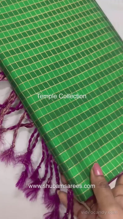 A vibrant blend of olive and parrot green checks, paired with a rich vadamalli purple pallu and blouse. Finished with a purple border, this soft silk saree celebrates classic Chettinad khattam charm with elegance.