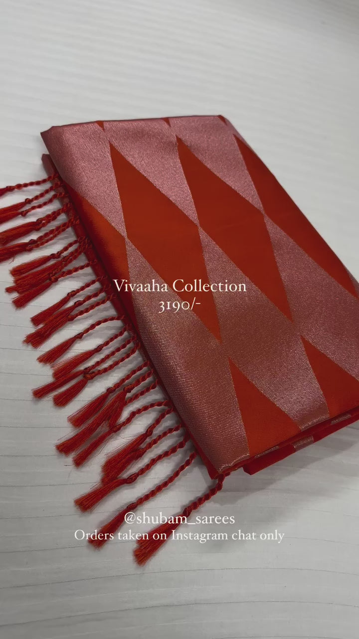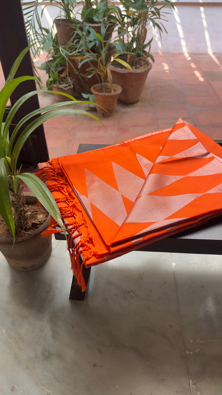 A vibrant orange soda-hued soft silk saree with a rich orange-gold pallu and a sleek borderless finish. Perfect for wedding vivaahas and Harley Quinn lovers!