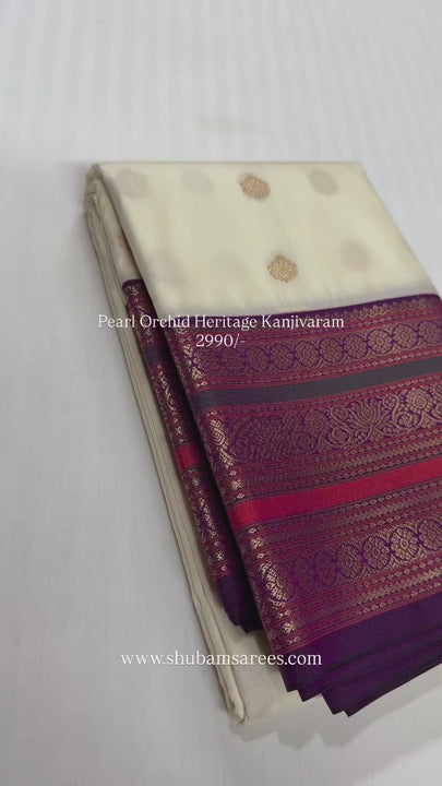 Pearl white body with orchid purple pallu and blouse, featuring a traditional dual-tone purple sunset and manthulir green border. Crafted in Kanjivaram silk for a timeless, elegant look.