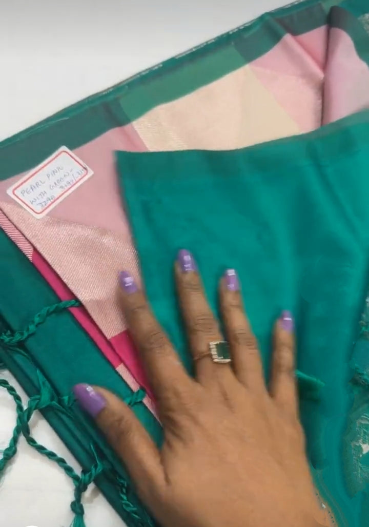 Pearl Pink with Green Soft Silk – Multicolour body, green pallu, green brocade blouse. Elegant and vibrant, inspired by Harley Quinn.