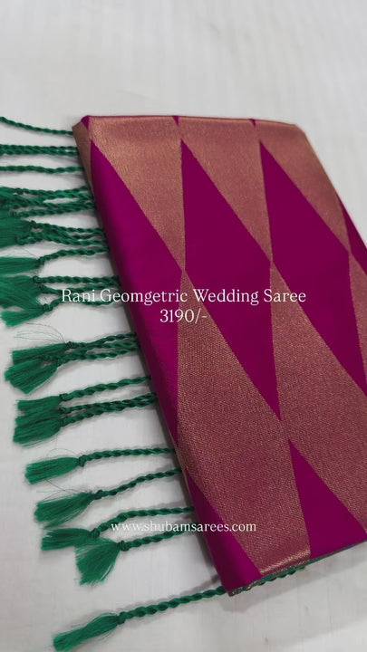 This soft silk saree features a vibrant rani pink body paired with an elegant emerald-green pallu and emerald-green blouse. Designed in a graceful borderless style. Perfect for wedding vivaahas and Harley Quinn lovers!