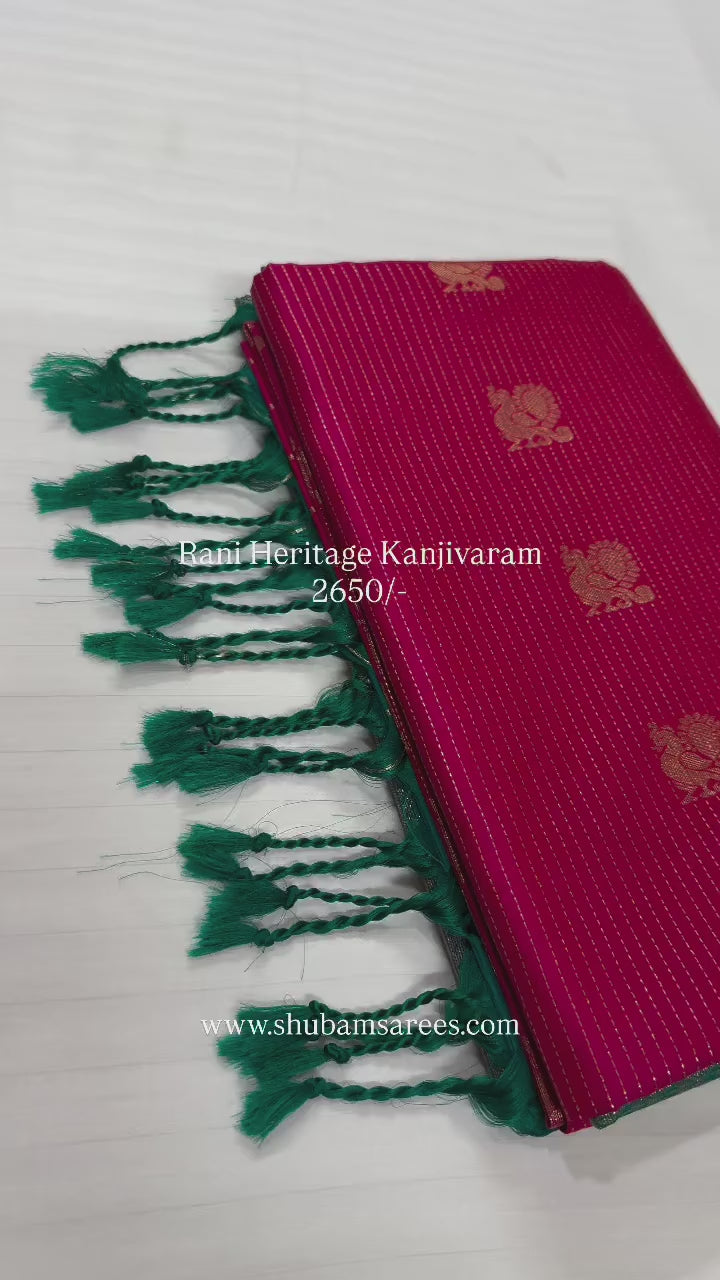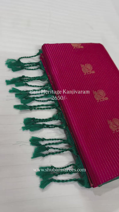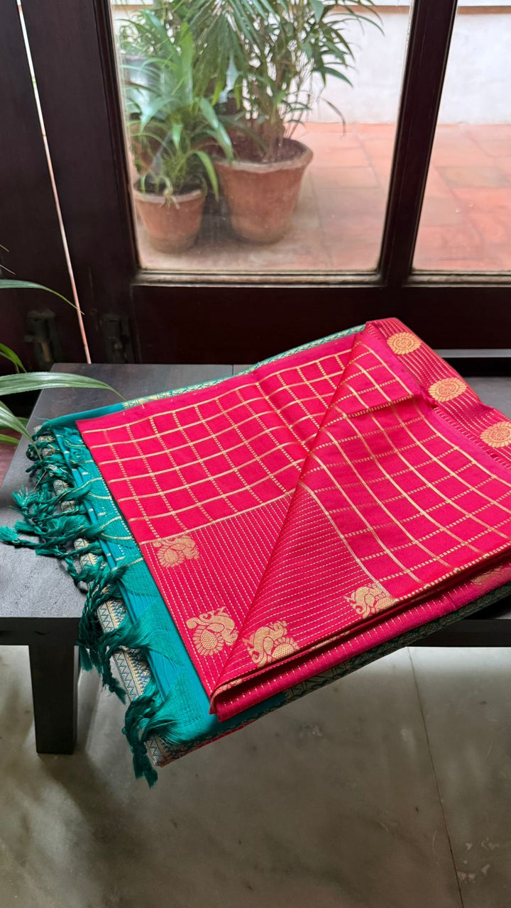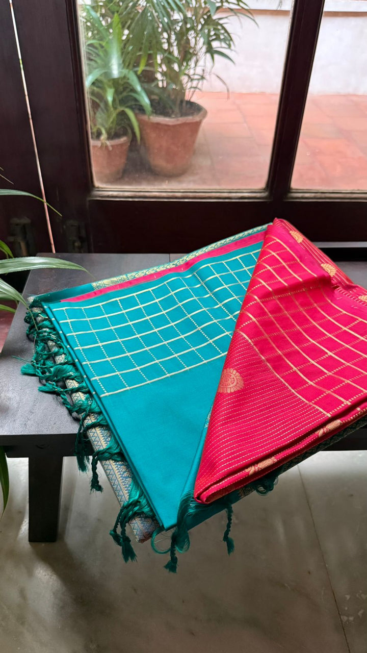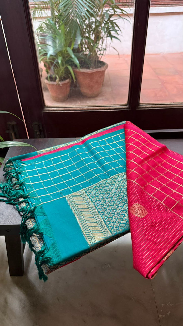 Rani pink body with Himalayan turquoise pallu and blouse, accentuated by a vintage khattam border. A classic Kanjivaram weave that blends vibrant tradition with timeless elegance.