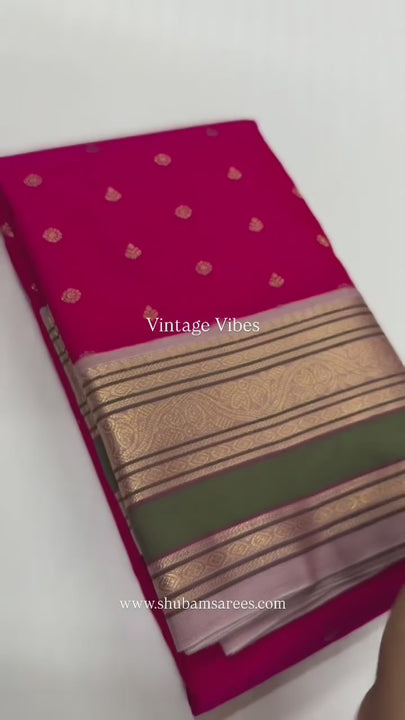 A graceful Kanjivaram featuring a rani pink body complemented by an onion skin pink pallu and blouse. The saree is enhanced with a pastel onion skin and manthulir green border, blending elegance with tradition — perfect for festive and special occasions.