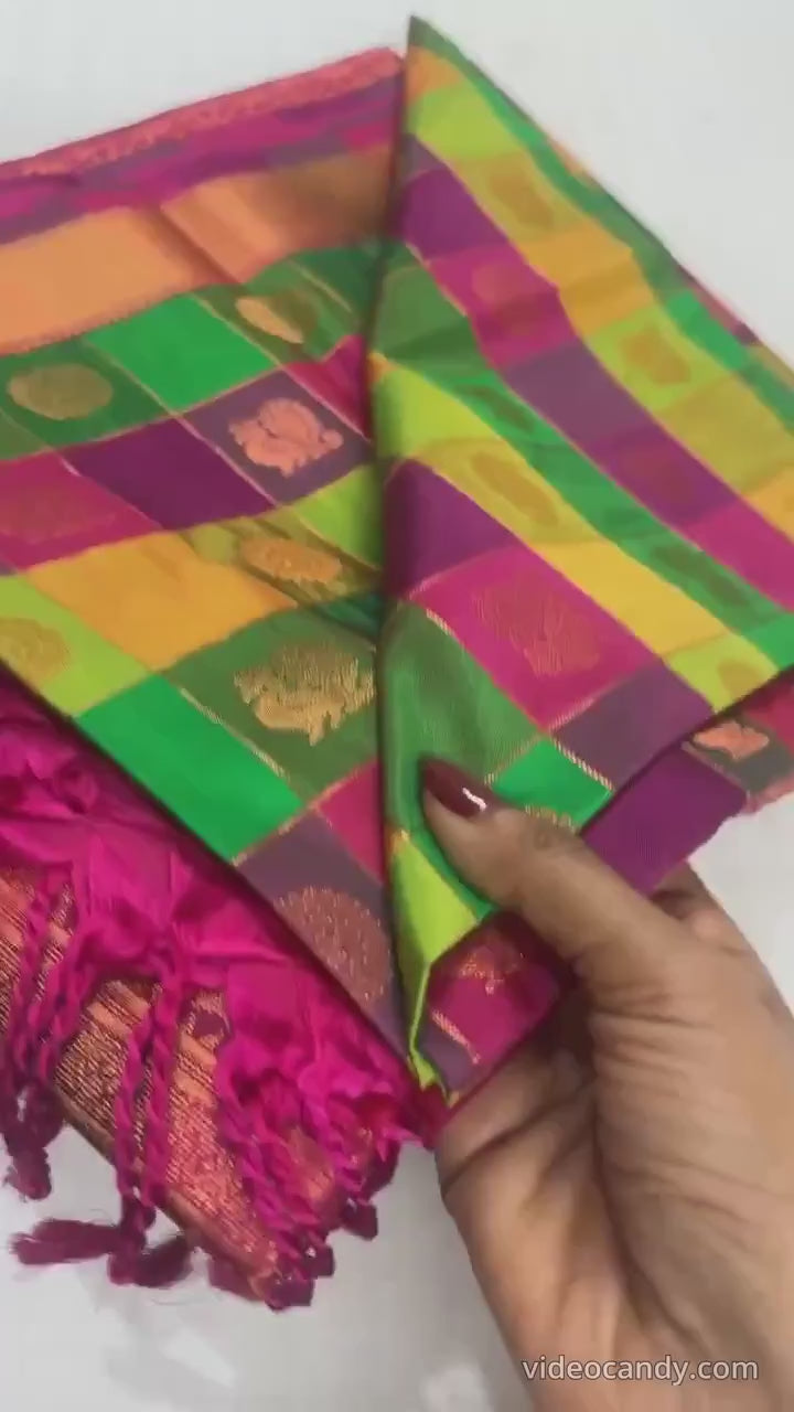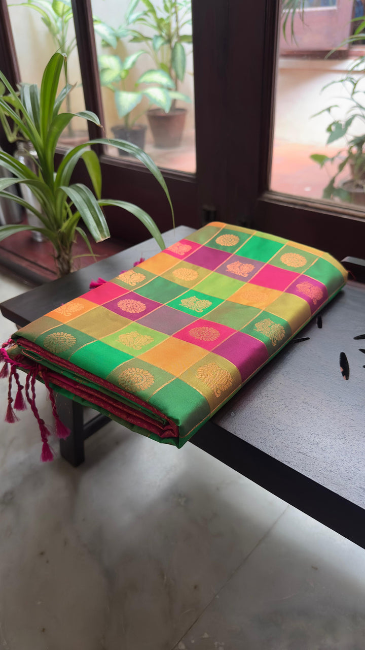 A vibrant Paalum Pazhamum soft silk saree in shades of pink, yellow, and green. Accented with a rani pink pallu and blouse, finished with a tiny getti zari border—perfectly festive and colourful.