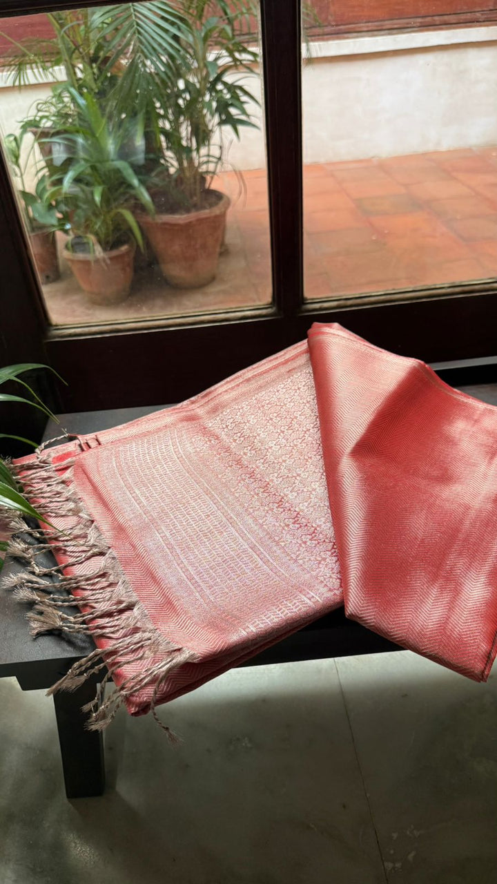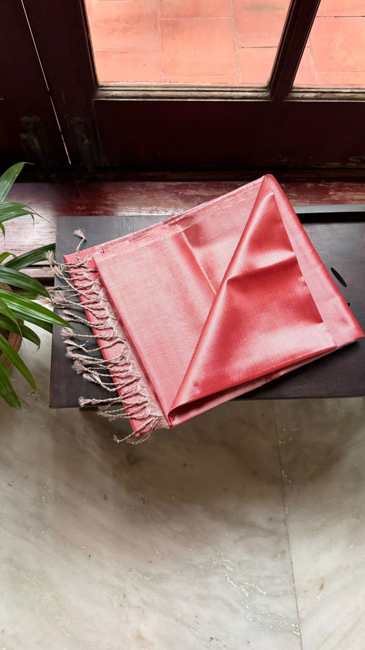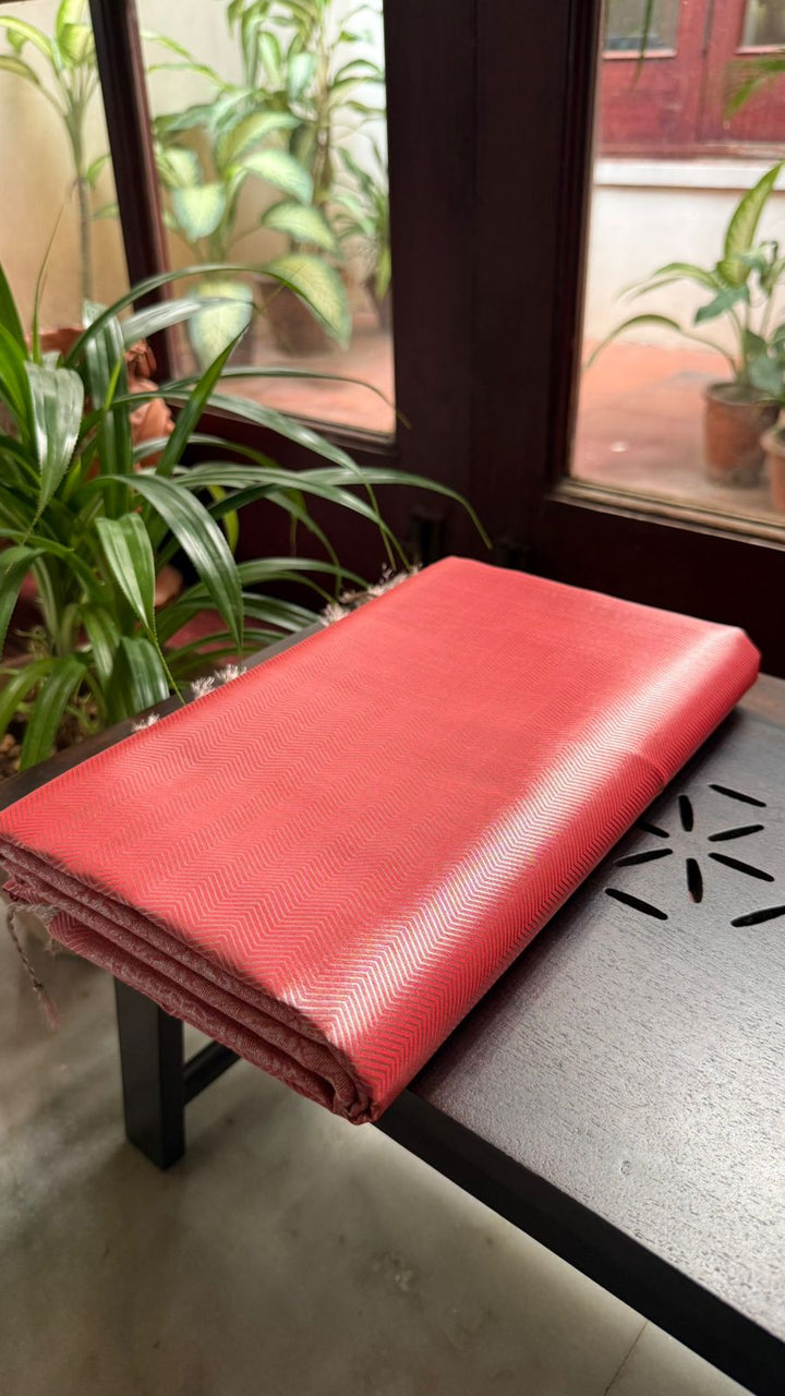 Coral pink soft silk organza saree with a graceful self pallu and blouse, designed in a borderless style for a sleek and elegant look.