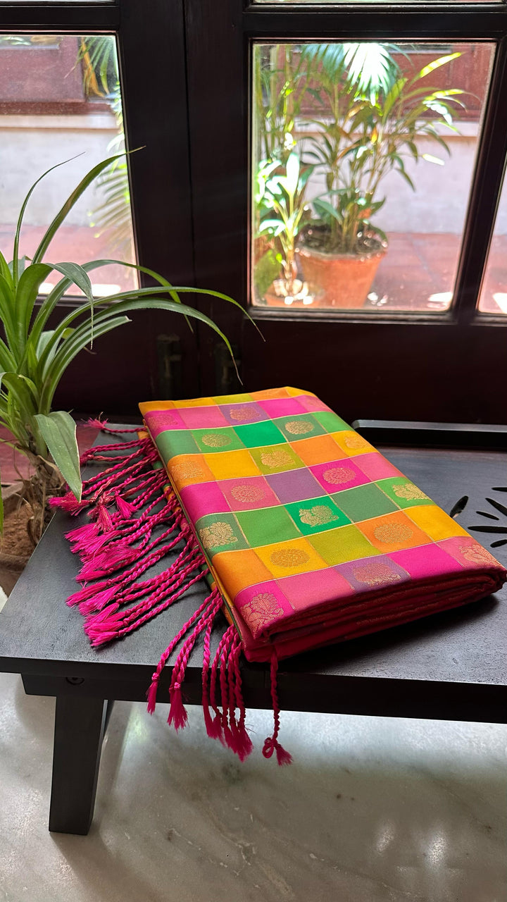 Rose garden in soft silk features vibrant multicolour checks with yellow, pink, mauve, and green. Paired with a pink pallu, blouse, and a subtle getti zari border.