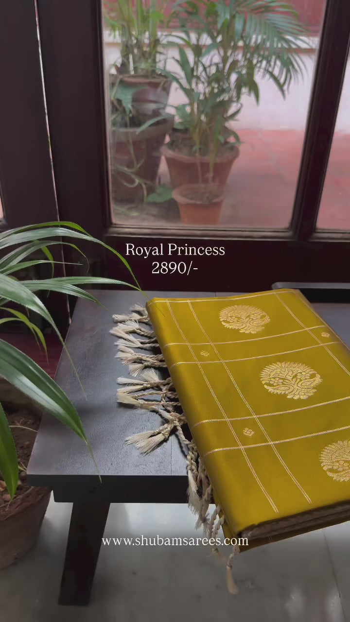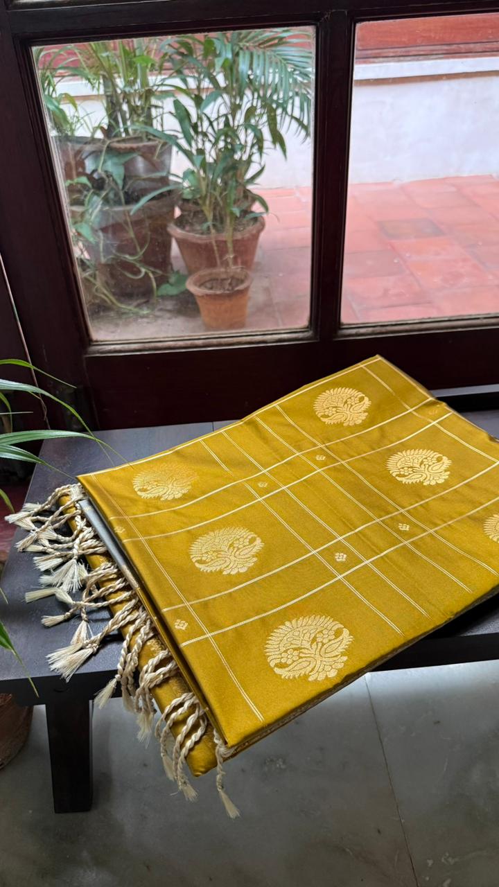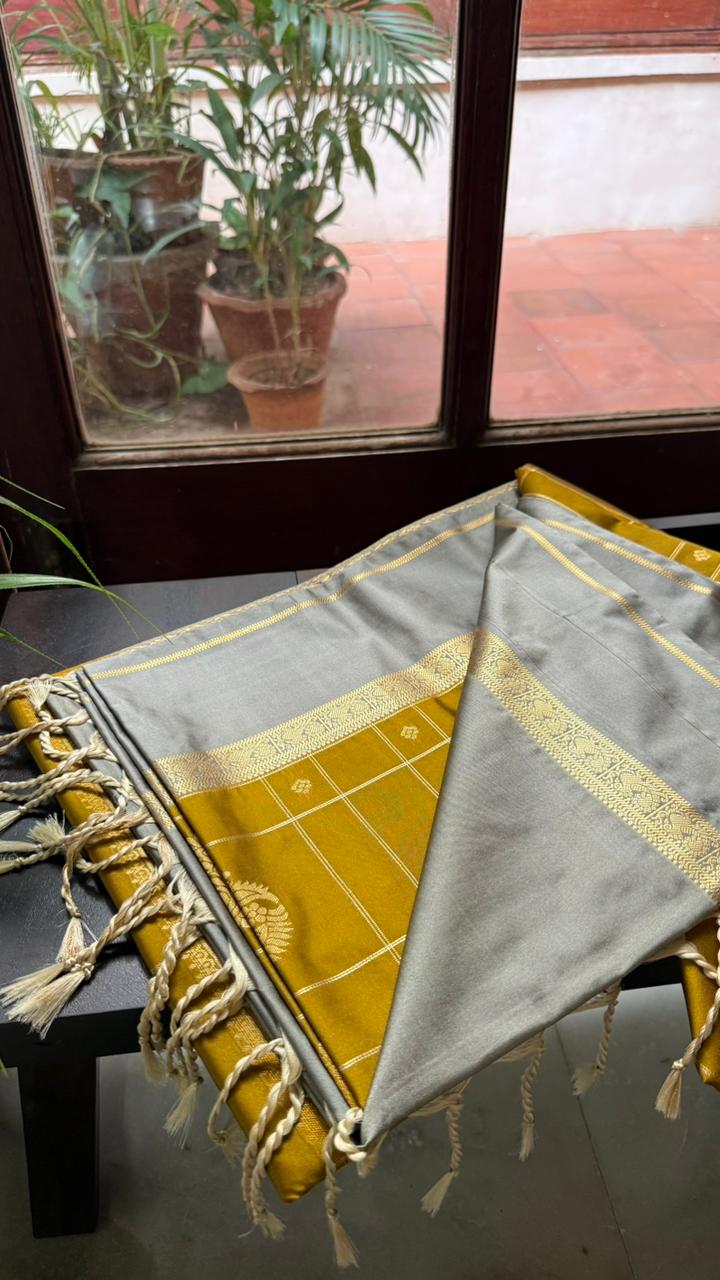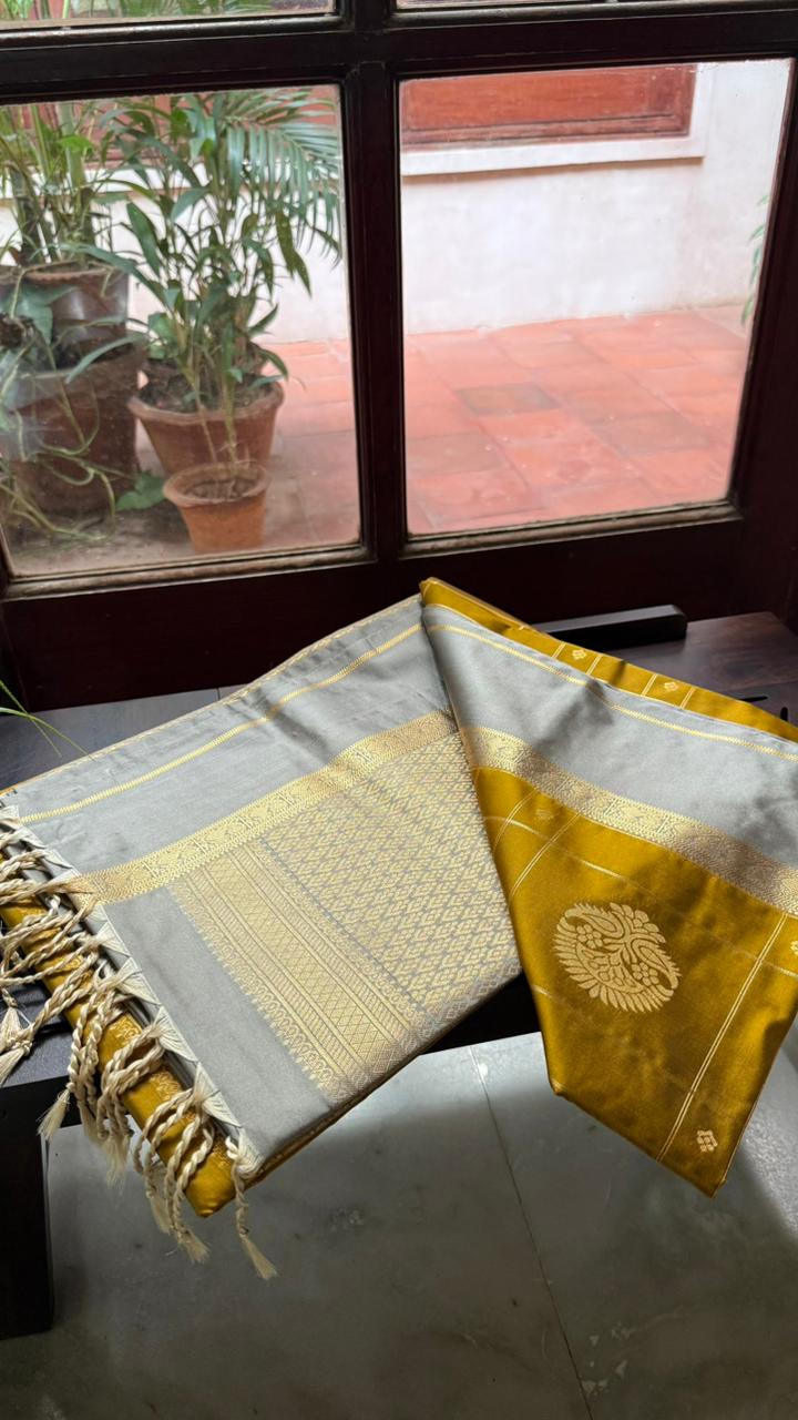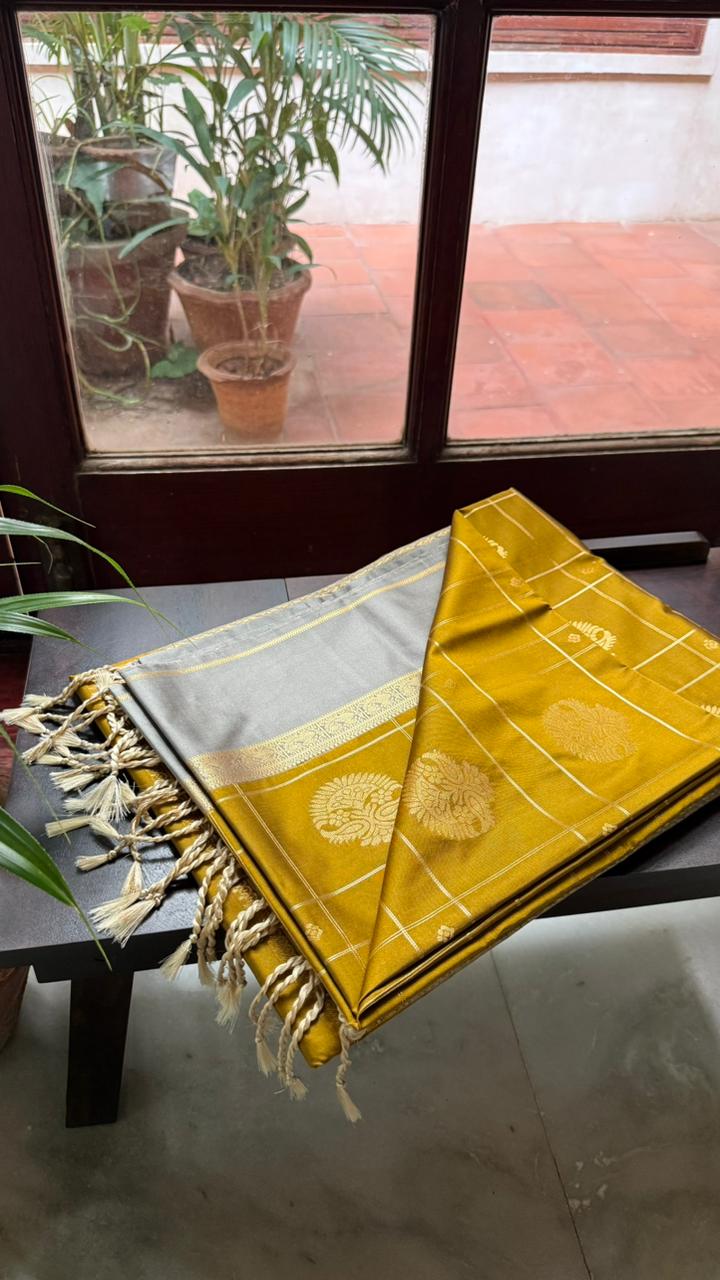 Golden fenugreek soft silk saree with an elegant moon grey pallu, moon grey blouse, and a classic rettai pettu border — a timeless blend of charm and tradition.