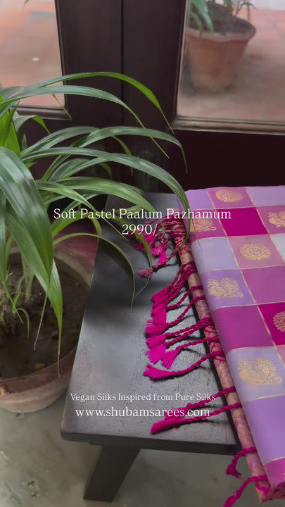 Soft silk Parambriya saree in multicolour checks with shades of lavender, lilac, mauve, pink, and pearl white. Features a rani pink pallu and blouse with a delicate getti zari border. Pastel tones, checks, and khattams detailing make it perfect for elegant occasions.