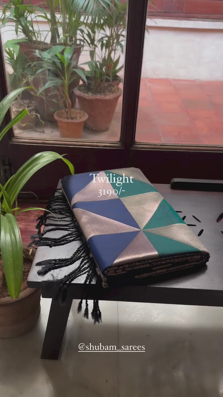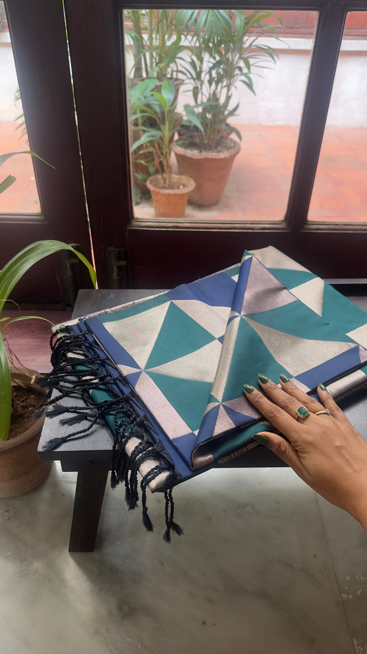 Twilight Harley Quinn Soft Silk Saree – A striking space blue/peacock green drape in geonetrical pattern with a grand yet elegant Space Blue pallu and blouse. Sleek, modern, and borderless for a seamless look. Perfect for those who love vibrant elegance.