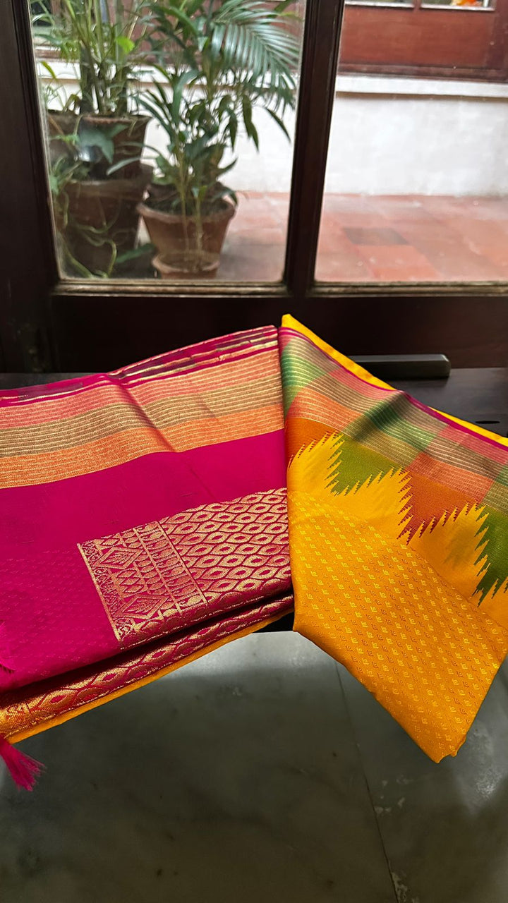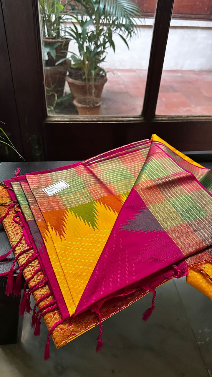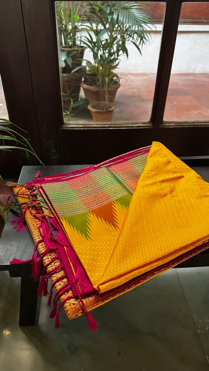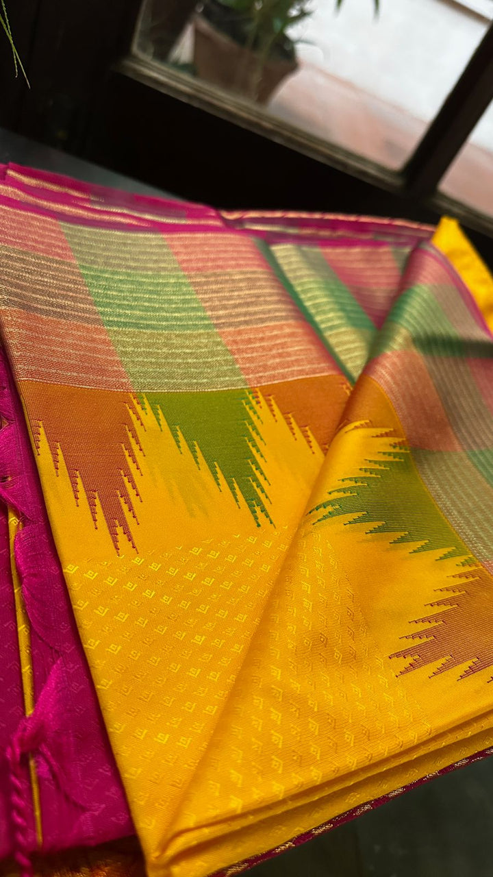 Yellow soft silk saree with rani pink pallu and blouse. Featuring a traditional kopuram border, this Parambriya saree is perfect for festive and cultural occasions.