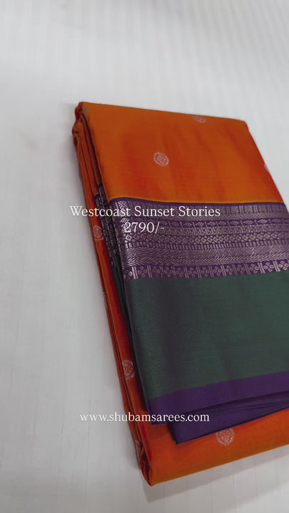 Drape elegance with this Vegan Kanjivaram saree in vibrant sunset orange, complemented by a deep blackcurrant pallu and blouse. Finished with a sophisticated Blackcurrant Meadow border, it’s perfect for making a timeless statement.